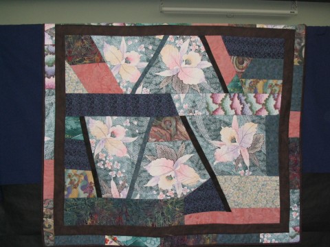 Sandra: "I couldn't bear to cut into the orchids so I made trapezoid shapes. Other pieces were worked in to enlarge the quilt. Machine sewn and quilted."