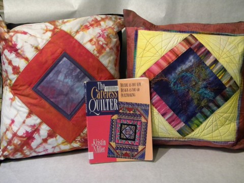 This two pillows are entitled "Red Web" and "Sea Weed at the Center". Donated by Jane Wilde, it was inspired by The Careless Quilter: Decide as you Sew, Design As You Go Quiltmaking by Kristin Miller, a former local who's influence on quilters of the area still resonates. Some of the fabrics used in these pillows are hand-dyed and both feature linen backs.