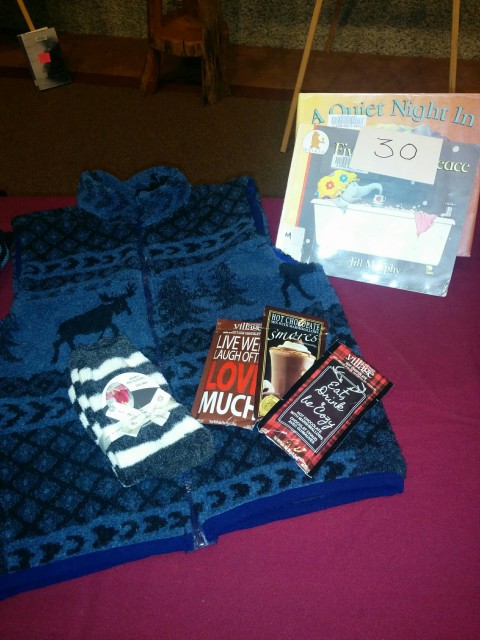An extra small or youth sized fleece vest has been paired with a pair of warm striped socks and pouches of decadent hot chocolate to make a cozy kit, to help you relax and cocoon when you get a few moments away from the kids or whatever else intrudes in your life. The vest was begun by the late Jean Clerihue with the zipper added and finishing work completed by Trish Banighen.