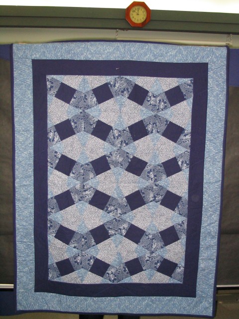 Sandra: "A simple nine patch square cut with the 'X' ruler, then machine sewn together and machine quilted. Pattern evolves from the placement of the X-cut nine patches."