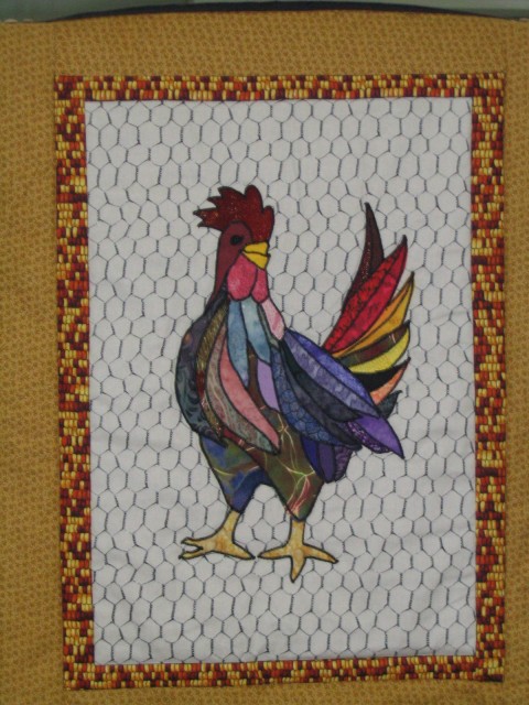 It's made from one of a series of rooster patterns, and is appliqued and machine quilted. It was completed in May 2006.