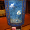 Inspired by the story of Saleem Sinai, born precisely on the moment of Indian independance. Donated by Ellen Little, it takes inspiration from the book Midnight's Children by Salman Rushdie, this quilted wall hanging features the silver spitoon first given to Saleem's sister by the Rani of Cooch Naheen as a wedding gift first given to Saleem's sister by the Rani of Cooch Naheen as a wedding gift. The snakes and ladders that signify the rise and fall of the family's fortunes are represented in the border of the quilt.