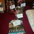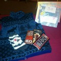 An extra small or youth sized fleece vest has been paired with a pair of warm striped socks and pouches of decadent hot chocolate to make a cozy kit, to help you relax and cocoon when you get a few moments away from the kids or whatever else intrudes in your life. The vest was begun by the late Jean Clerihue with the zipper added and finishing work completed by Trish Banighen.