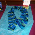 This scarf is made of silk and seacell, which is a fibre made of seaweed. It uses “Handmaiden” yarn from local Coastal Fibre, and took fifty hours to create the five foot long and foot wide scarf.