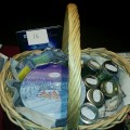 This basket includes a linen towl, decorative tin, with pumpkin and cream cheese muffins, three kinds of homemade ribes jam, honey, dried spearment, chocolate mint and mettles for tea and some extras. A great year of berries meant jam, which led to thoughts of tea...and muffins...and Dog Creek honey...
