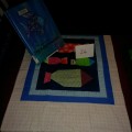 This fish table runner was pieced together with squares and rectangles, some cut in half to form triangles. The geometry of the piecing is highlighted by a wandering bright yellow stitch to hold it together, and this table runner measures 33 by 13 inches.