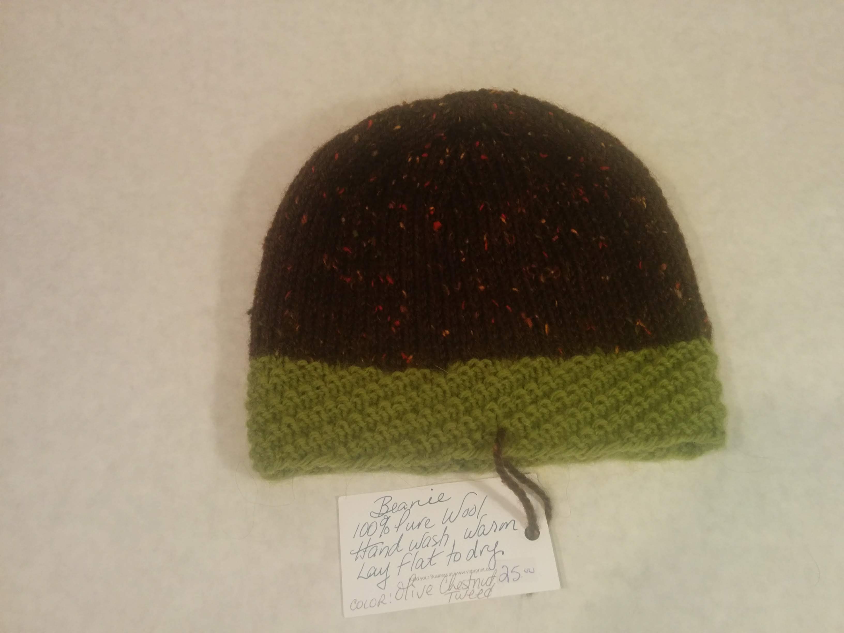 These one hundred percent wool beanies each took four hours to create plus twelve dollars in materials. One is in earthy green and brown tweed, while the other is in a more liquid shades of blue, either would be great to keep your head warm in the winter to come. We've paired it with Warm Clothes by Gail Saunders-Smith.
