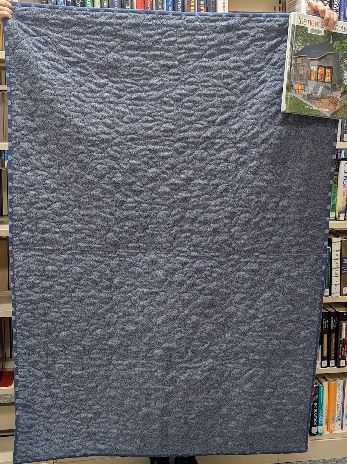This Bitty Bungalow quilt is 41" x 57", making this cozy, comfy quilt best as a lap quilt or a child's quilt. It's backed by a soft fabric called "Fireside in matted grey and topped with cotton.