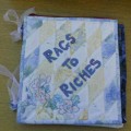 The book includes the following blocks: Rags to Riches; Cloth of Heaven; Colour Wheel; Pieced Log Cabin; 9 Patch Sandwich; Pond Life; Towhee. Adrienne made this book to give examples of how a quilt is made.