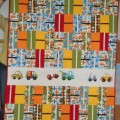 This quilt was created because I wanted to find a way to showcase a new line of organic fabrics that had come into the store. I looked online and and found a project by Elizabeth Hartman (called Birthday Cake) that I liked, so I tried to create something like it, but with something fun in it to draw the eye. I ended up creating the center applique panel with some fabulous little vehicles on a busy street. I had a lot of fun quilting this one, and drawing the air movement and exhaust around the cars.