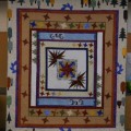 The challenge for the 12 quilters who sewed on this quilt was to find the right fabrics, techniques, sewing time and creativity to add, at their turn, to the purple centre square I provided. There were no patterns, measurements or final vision in mind except my note: “I like all colours and surprising combinations”. Every two months, the growing quilt was passed to the next quilter: flying geese, seminole piecing, tilting, sunrises and special fabrics, colours and symbols of family and friendship were added.