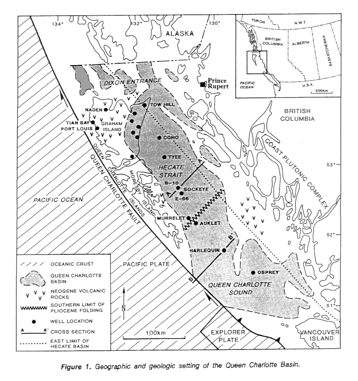 Dietrich, J.R., 1995. Petroleum resource potential of the Queen Charlotte Basin and environs, west coast Canada. Bulletin of Canadian Petroleum Geology, V. 43, No. 1, p. 20-43.