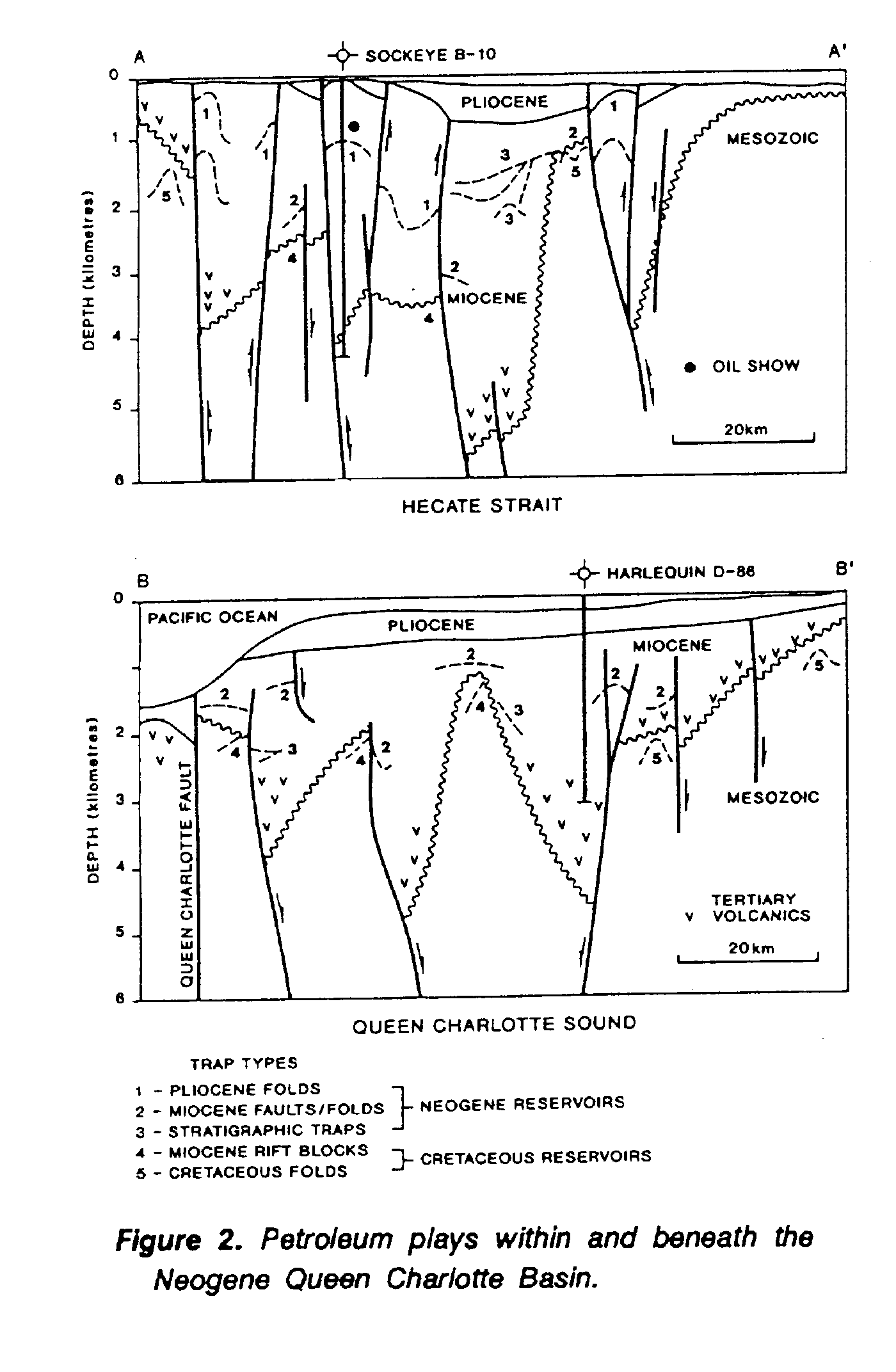 Figure 2 (Click on picture at right to get full image) Petroleum plays within and beneath the Neogene Queen Charlotte Basin.