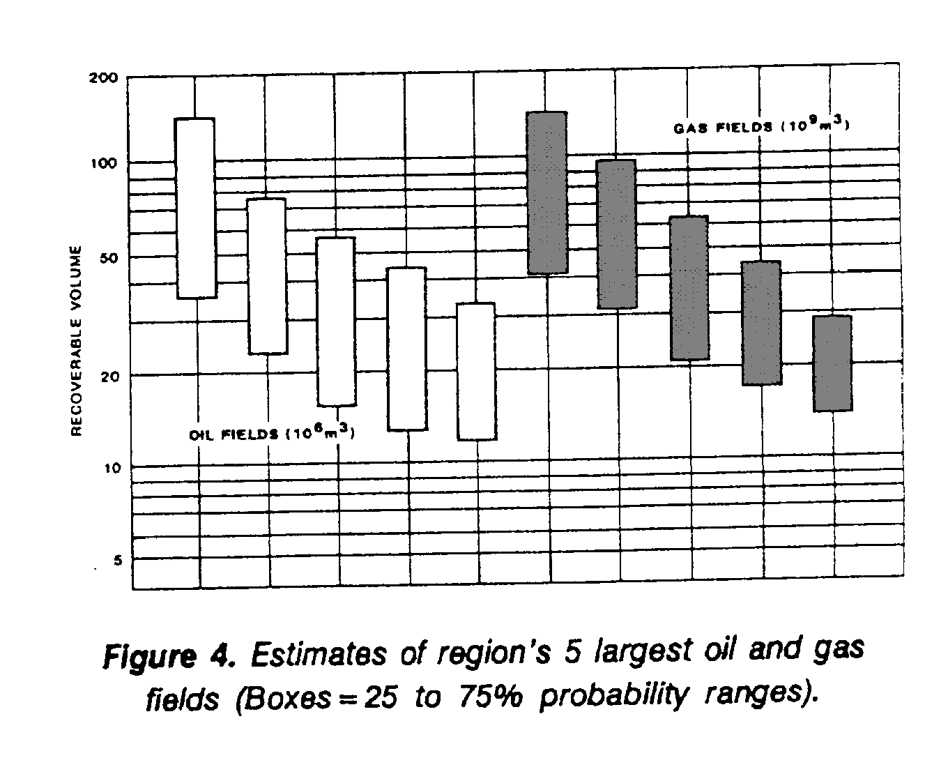 Median value estimates of the region's total petroleum potential (from all plays) are 414 x 106m3 (2.6 Bbbl) of recoverable oil and 565 109m3 (20 TCF) of recoverable gas (Fig. 3).