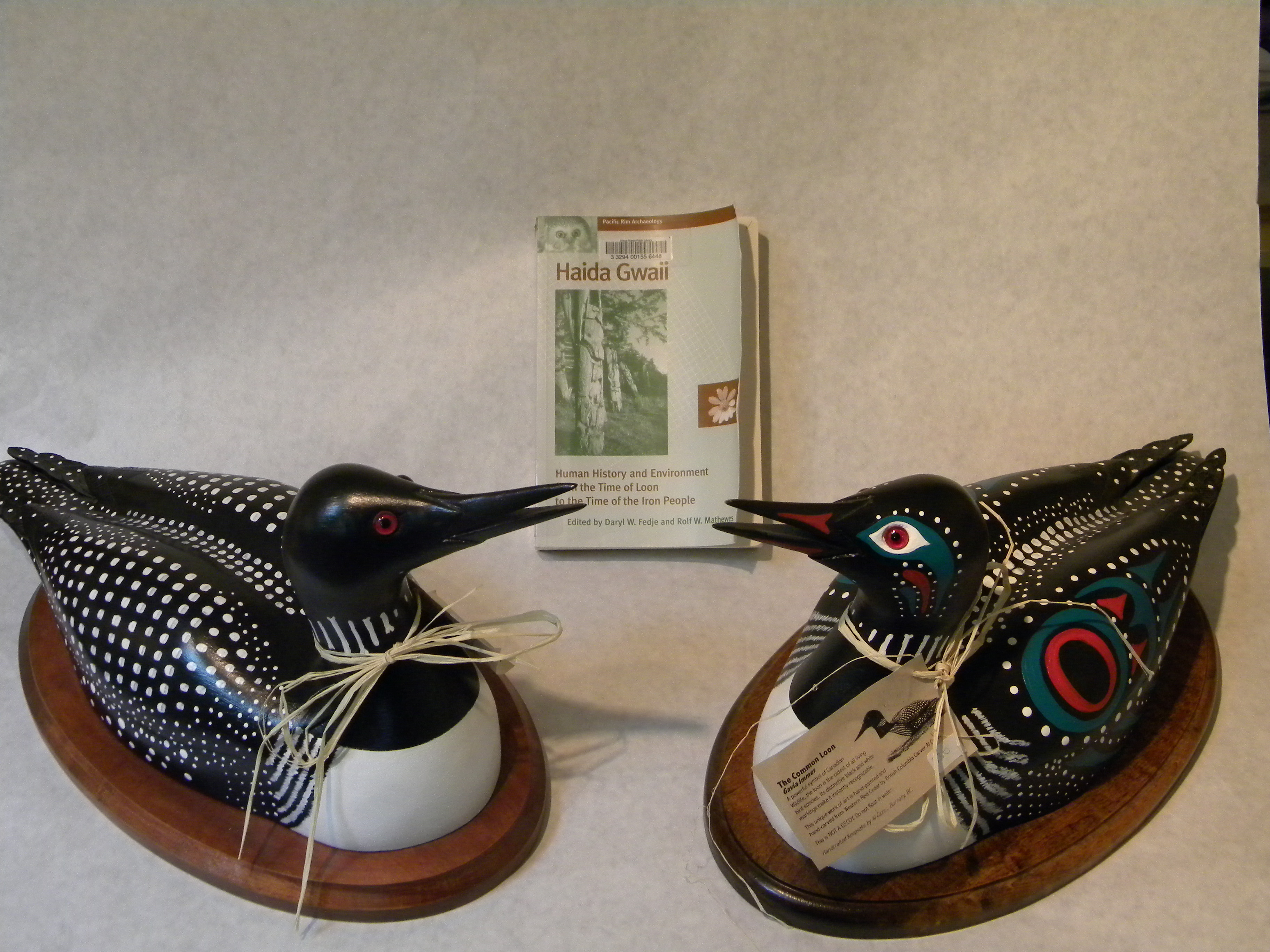Two beautiful, hand-carved wooden loons. Donated by Hans and Irmgard Buchholz from Studio 9, these two loons were hand-crafted by Al Cazes of Burnaby. Carved from Western Red Cedar, this submission was coupled with Haida Gwaii : Human History and Environment from the Time of Loon to the Time of the Iron People by Daryl Fedje.