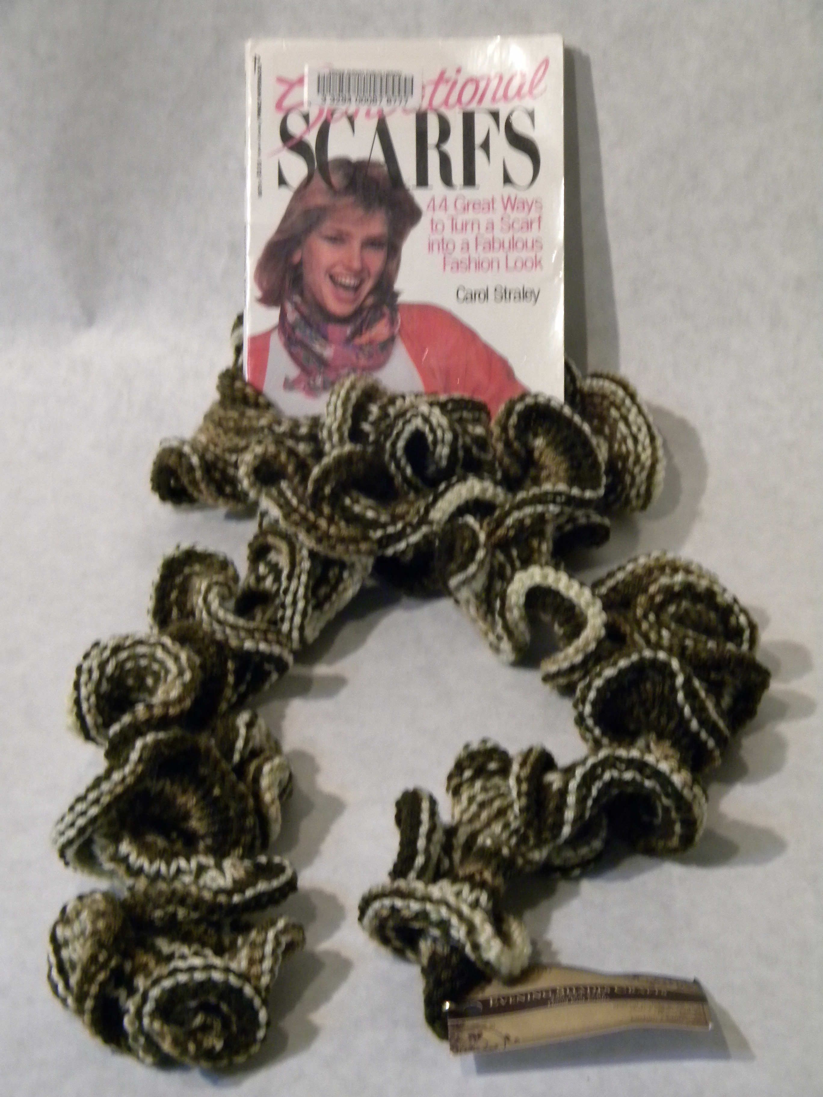 This camoflague brown scarf is a collection of curls. It was donated by Rosa Robichaud, and has been coupled with Sensational Scarfs: 44 Great Ways to Turn a Scarf into a Fabulous Fashion Look by Carol Straley. The scarf is 52" long and machine washable.