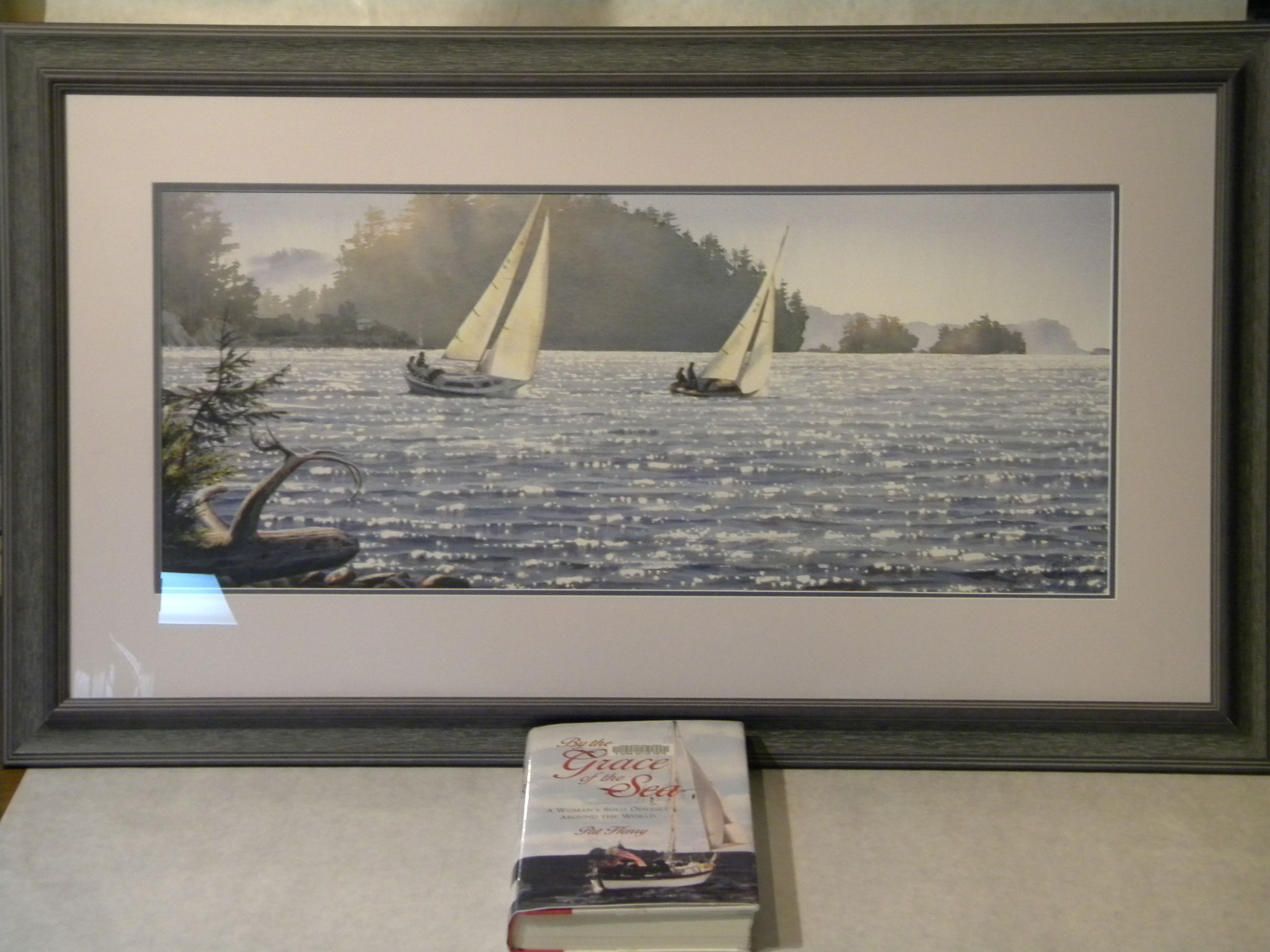 This picture, entitled "Sunlit Sails", features a gorgeous scene of sailboats upon the bay. Donated by Hans and Irmgard Buchholz from Studio 9, it was coupled with By the Grace of the Sea: A Woman's Solo Odyssey Around the World by Pat Henry. This is a limited edition print of 350 of the original painting by Carol Evans.