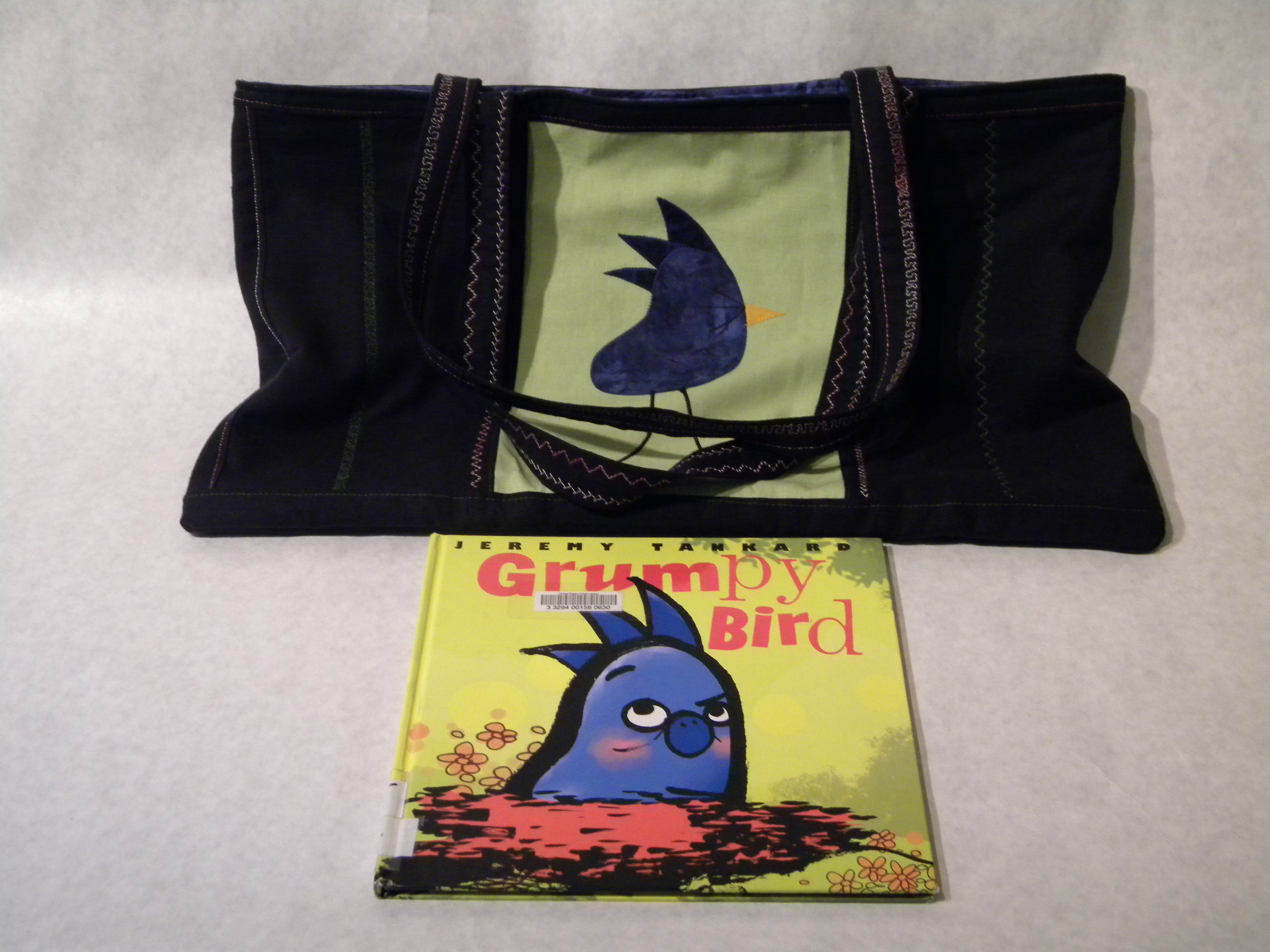 You can use this bird themed tote bag to carry Grumpy Bird by Jeremy Tankard, the book it was inspired by. Donated by Mariana Hulsen, the bag features a three panel design and is about two feet wide, able to be filled with a lot of library books or other things.
