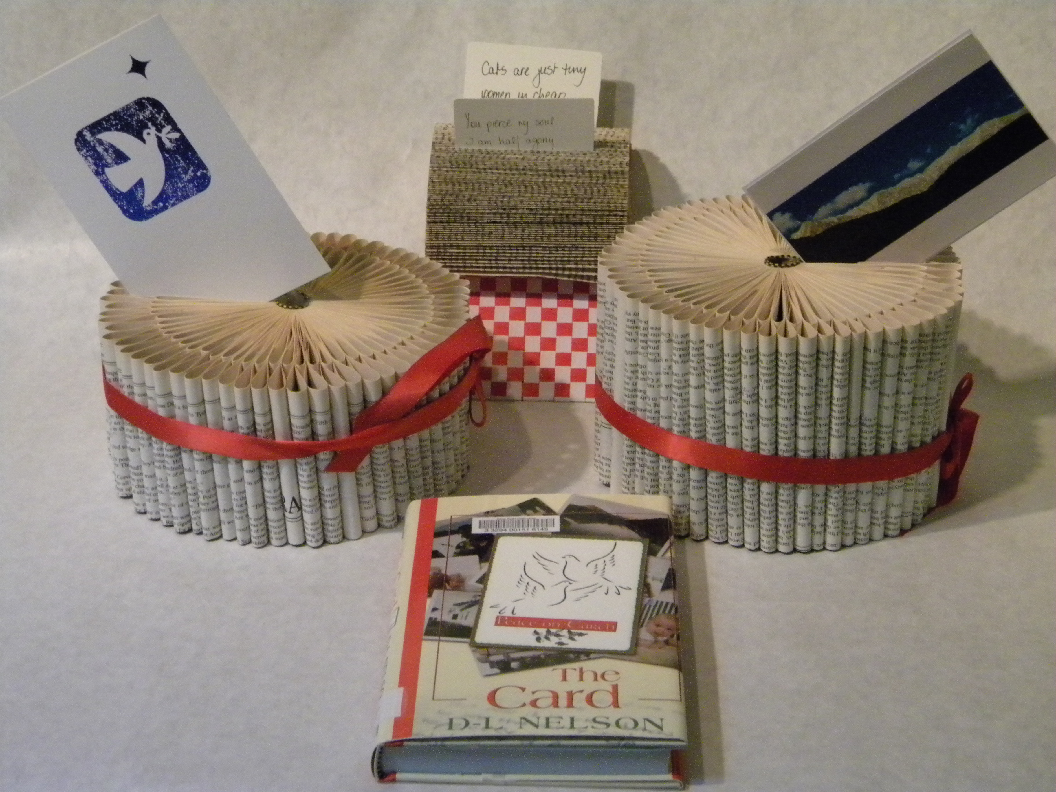 These beautiful card holders are the result of the recycling of actual books, but don't worry, they had it coming to them. Donated by Rae Klassen, they have been coupled with The Card by D.L. Nelson. Excellent for displaying Christmas cards, business cards, or even todos or notes!