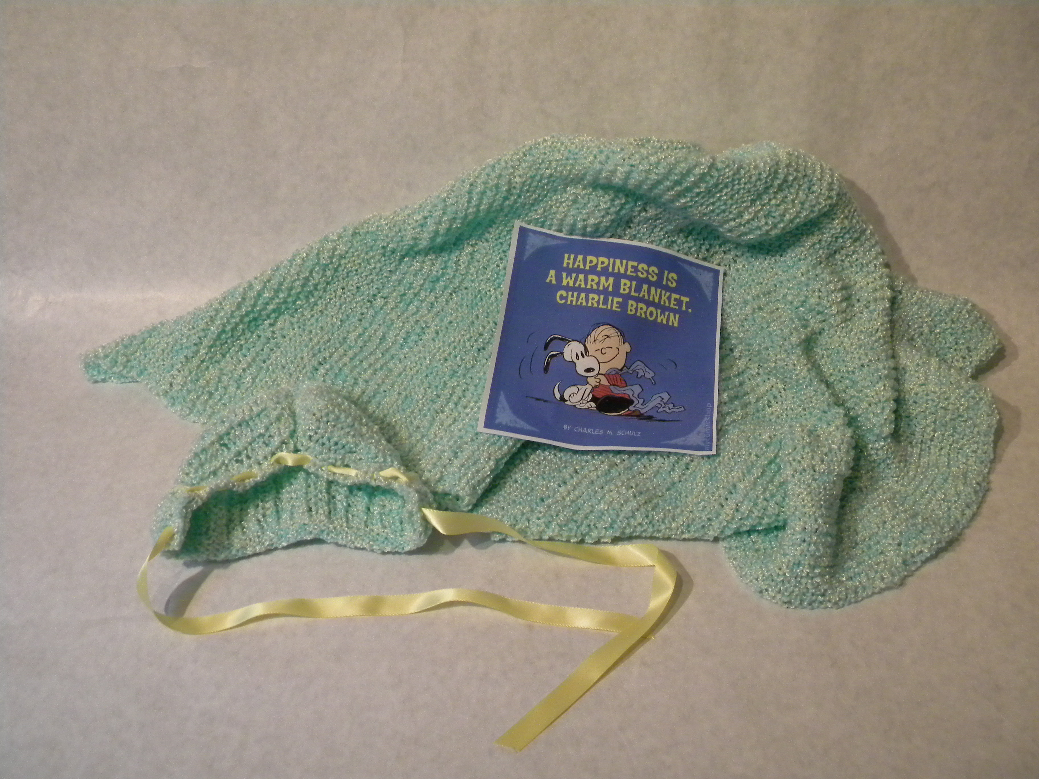This beautiful baby blanket and hate are made from soft green wool. Coupled with Happiness is a Warm Blanket, Charlie Brown by Charles M. Schultz, it was donated by a friend of Cindy Payne. Super soft, this knit is perfect for even the youngest of children, though you might want to be careful the dog doesn't steal it...