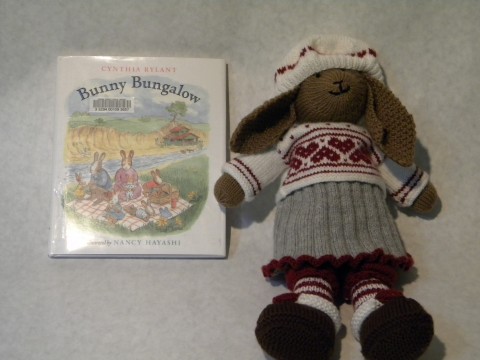 Anika Rabbit is 100% hand knit from shoes to cap from 100% Merino wool. Created by Leah Cuthbert, it was inspired by Bunny Bungalow by Cynthia Rylant. It was created using a pattern produced by Mary Jane's Tearoom.