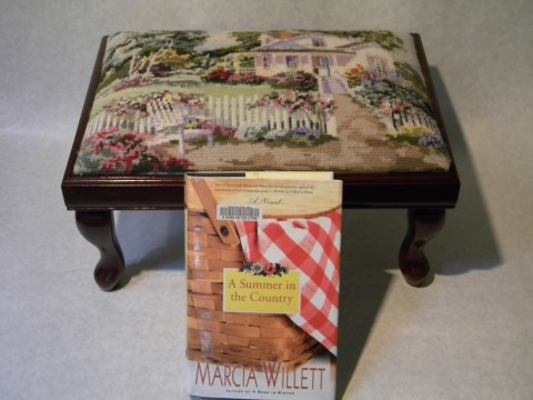 This footstool has Daydream Cottage pattern from Bucilla done in needlepoint on the fabric top. Created by Coral and James Carr, it has been coupled with A Summer in the Country by Marcia Willett. It took three months to complete this piece of art.