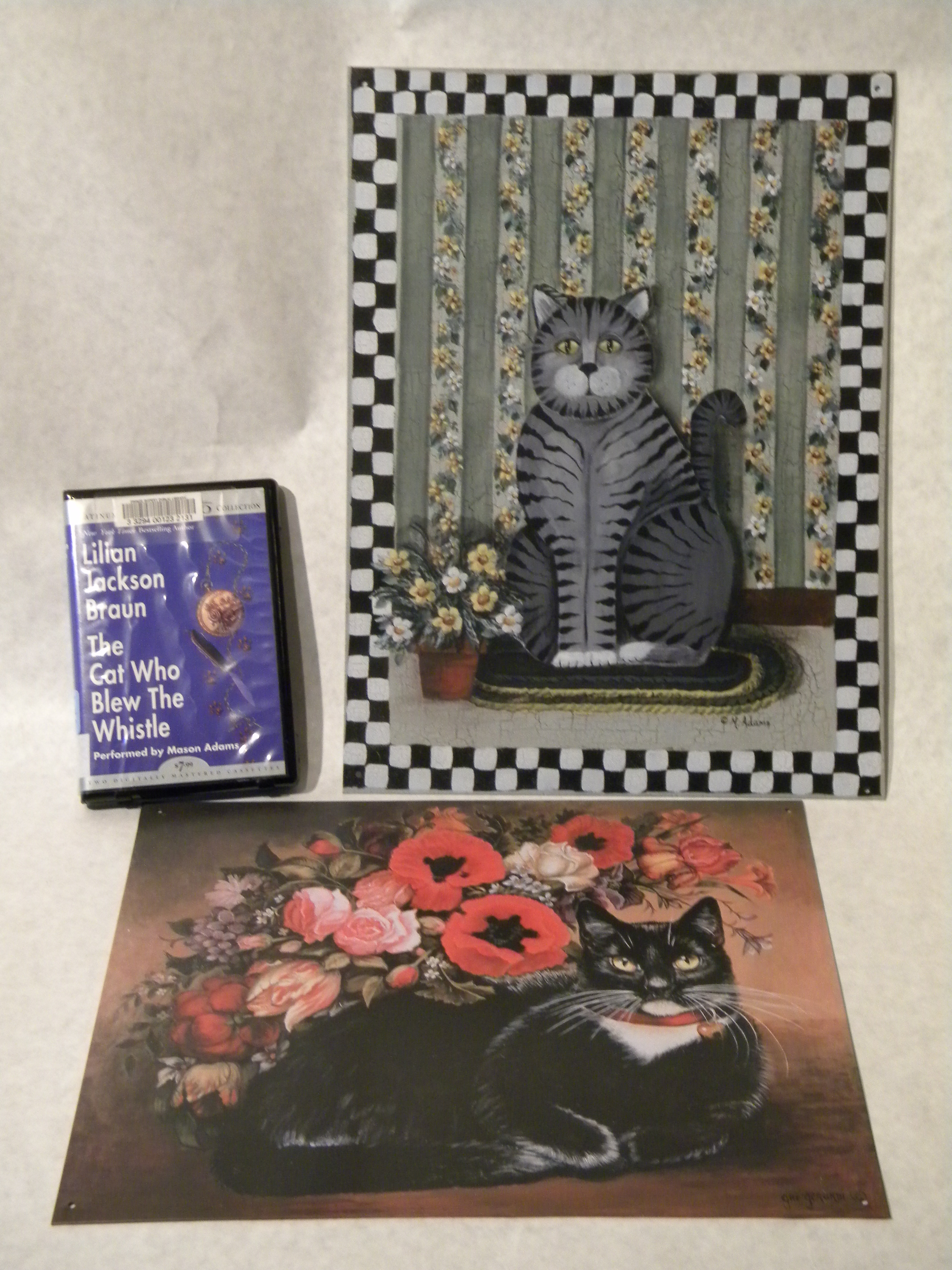 These two large tin signs feature two types of art styles but the same type of subject. Donated by Coral and James Carr, they have been coupled with The Cat Who Blew the Whistle by Lilian Jackson Braun. Each is twelve by fourteen and a half inches in size and have holes in the corners for hanging.