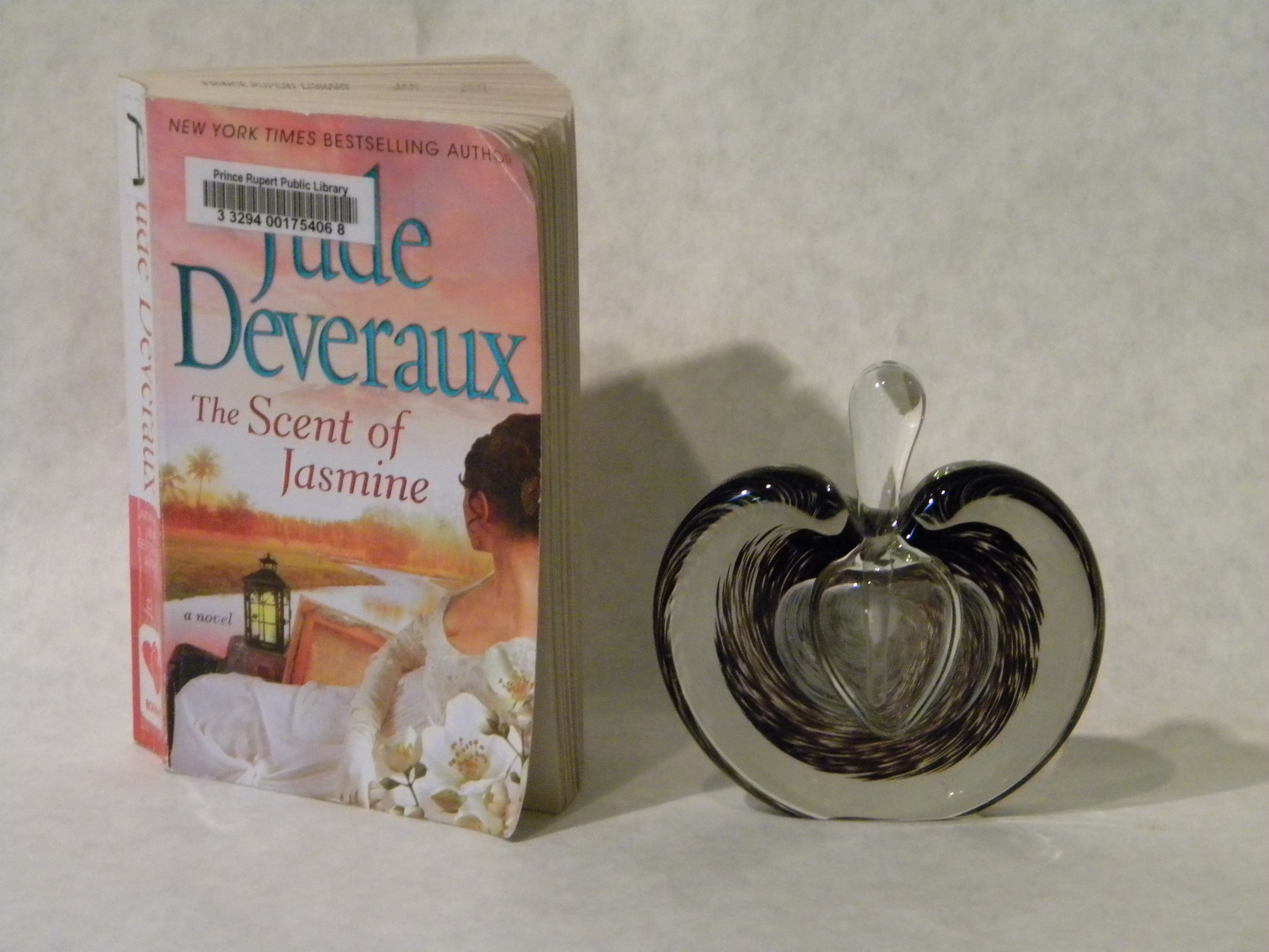 This crystal perfume bottle is perfect for the scents you love. Donated by Coral and James Carr, it has been coupled with The Scent of Jasmine by Jude Deveraux. The bottle is four and a half inches high with the stopper.