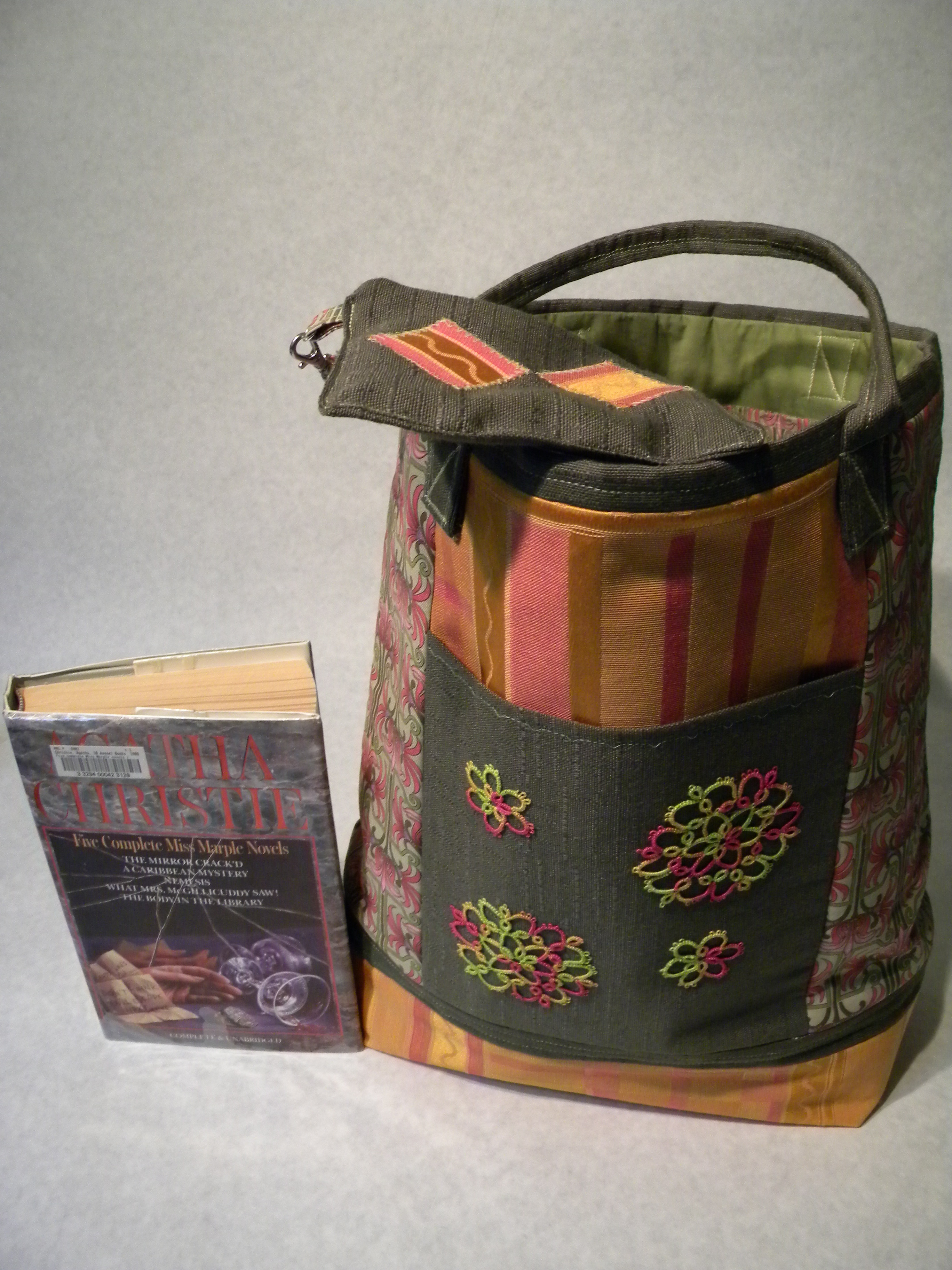 A generous sized project tote with numerous inside pockets and a matching detachable tool pouch for all your knitting fiddly bits. Leah Cuthbert decorated the outside of the bag with hand tatted shuttle lace and was inspired by Miss Marple, Agatha Christie's intrepid geriatric sleuth with her knitting tote over her arm as she solves another case of murder most foul; for instance, The Body in the Library.