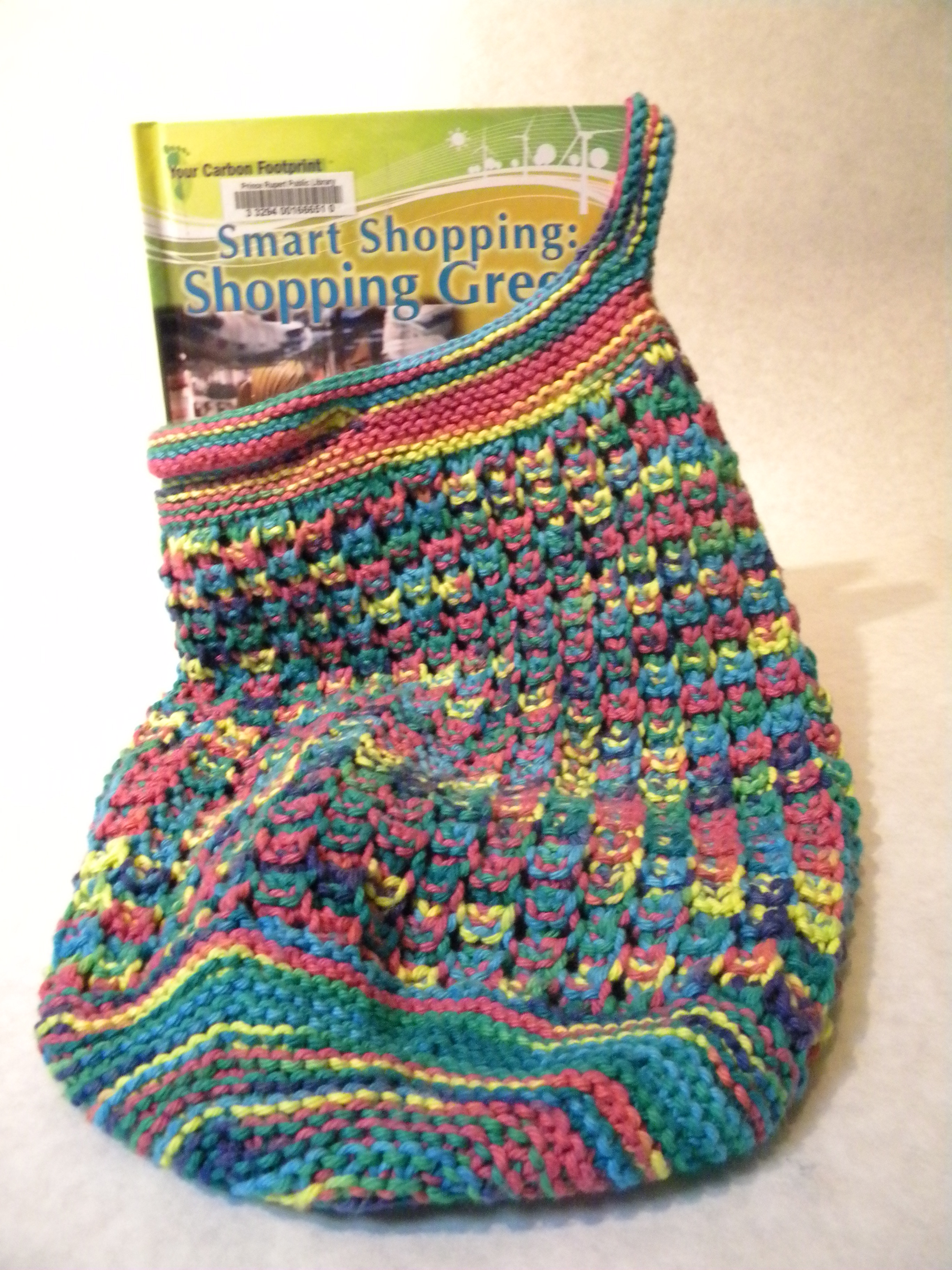 This colourful eye catching bag was knit with a variety of stitches and yarn colours. You can give plastic and paper bags a pass when you've got this bag in your hand! This bag took Anna Delloch six hours to knit, and has been paired with Smart Shopping: Shopping Green by Jeanne Neagle.