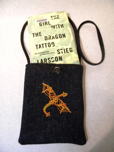 This purse or e-reader will fit an iPad or similarly sized tablet, and was "upcycled" from an old wool coat. The lace dragon was stuttle-tatted and appliqued to the front. The dragon was also inspired by the Stieg Larsson book The Girl with the Dragon Tattoo.
