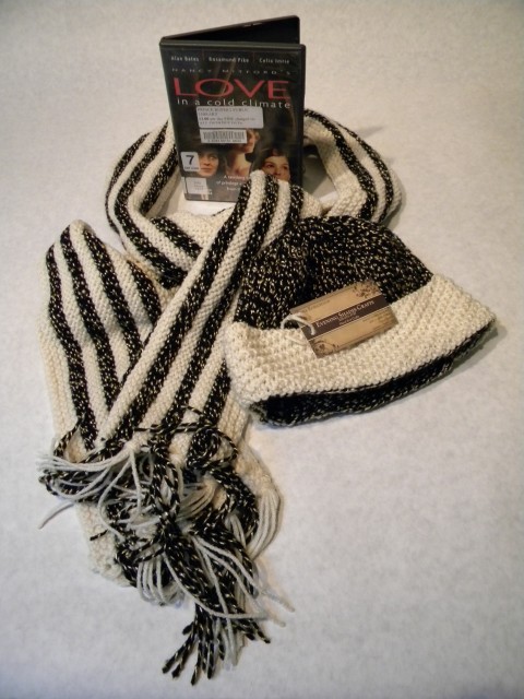 This pair of beige and black knits has a secret; when you roll down the brim of the toque it becomes a slouchie hat. Hat and scarf were donated by Rosa Robichaud of Evening Shades Crafts and paired with the movie Love in a Cold Climate.