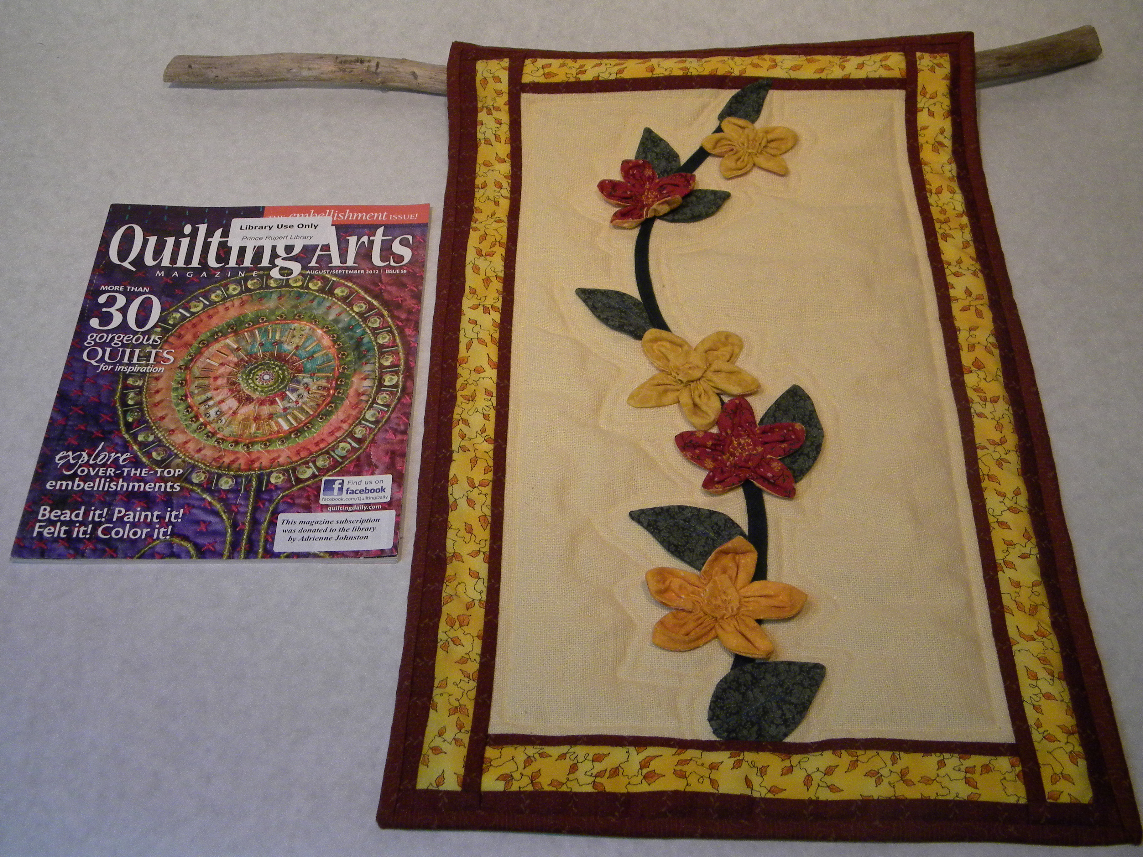 "Fire Flower" is a 14" x 23" wall hanging with optional driftwood rod that took fifteen to twenty hours to create. The leaves and flowers are 3-D, and the materials were donated and graciously accepted. Part of the inspiration for this work came from Quilting Arts Magazine, the subscription for which was donated by Adrienne Johnston.