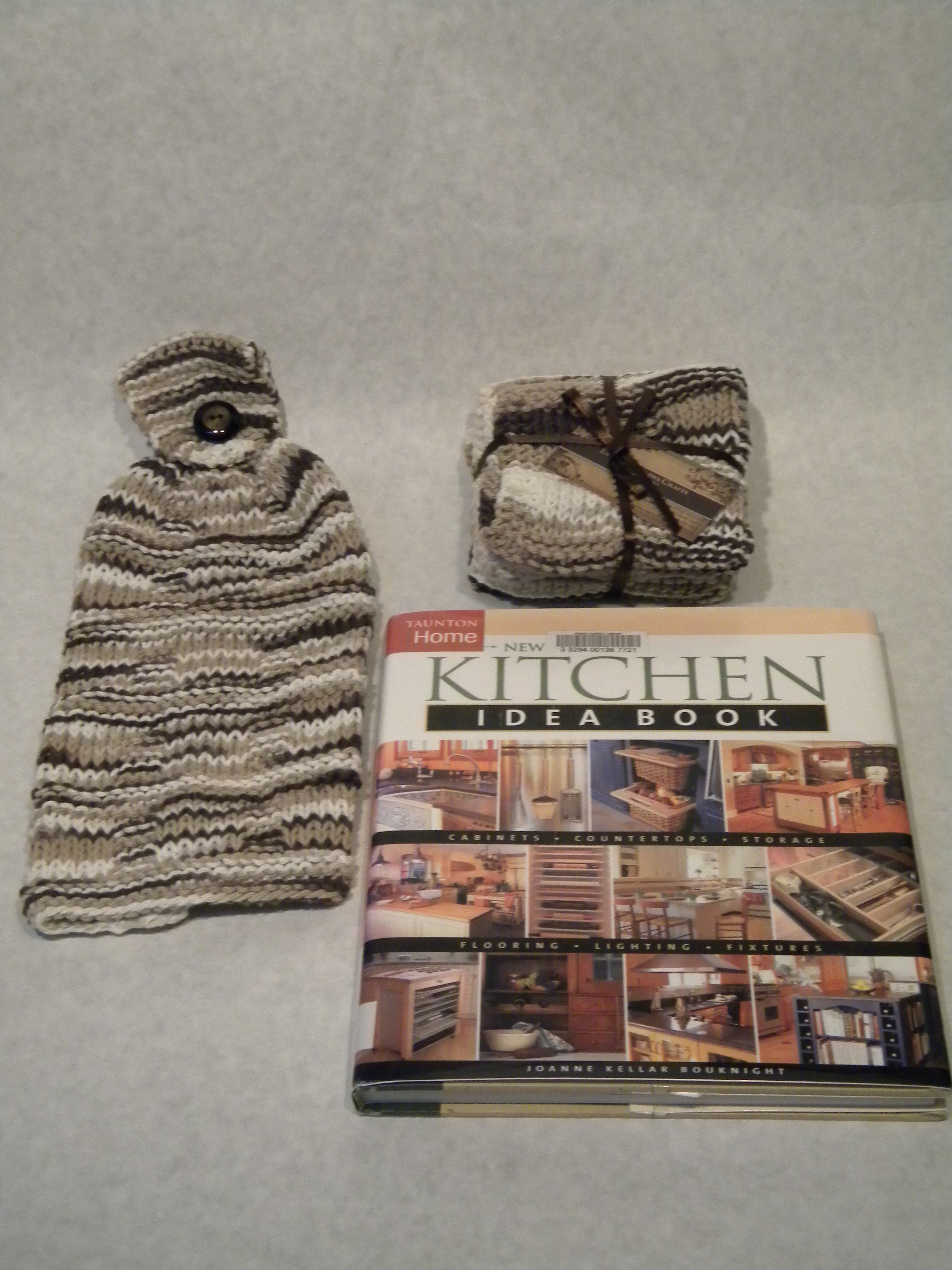 These hand-knit cotton dish clothes and hand towel are wonderful neutral colors that would pair well with almost any kitchen. It's been paired with the New Kitchen Idea Book by Joanne Keller Bouknight.