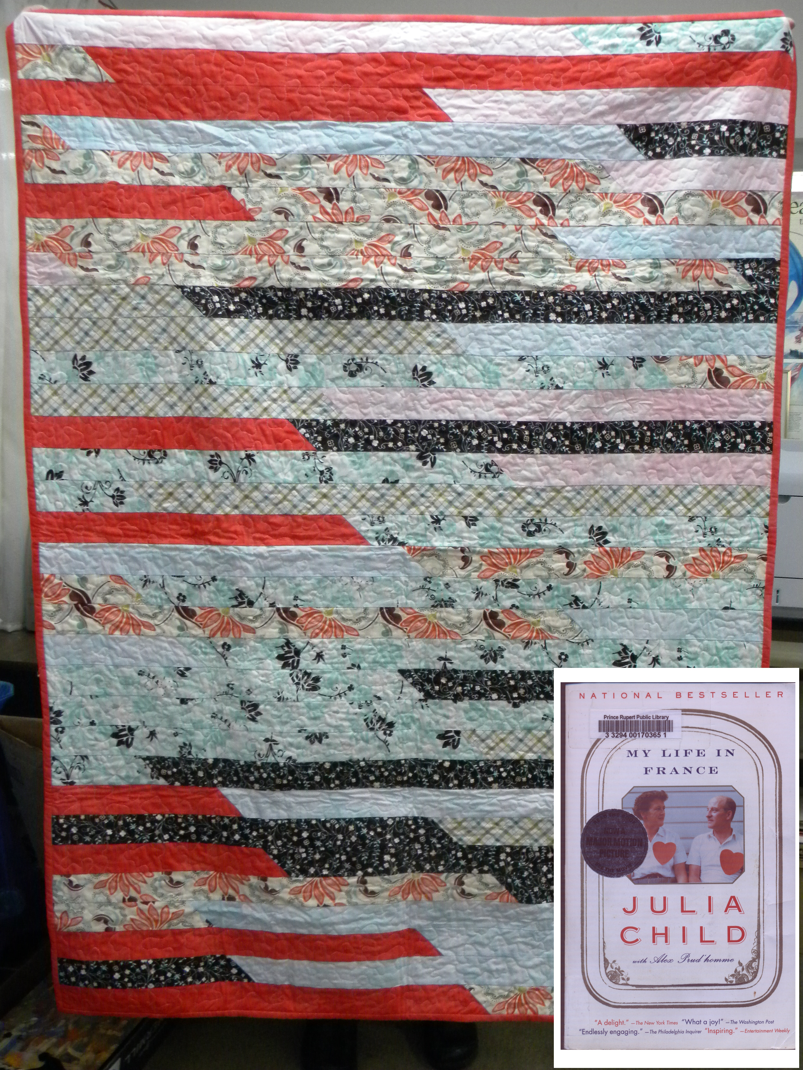 This beautiful quilt has been entitled Paris and is donated to us by the Big Rain Quilt Guild. The horizontal stripes with diagonal breaks is beautiful, with strong patterns catching the eye and bright red bringing a classic color to the piece. It's paired is My Life in France, Julia Child's autobiography.