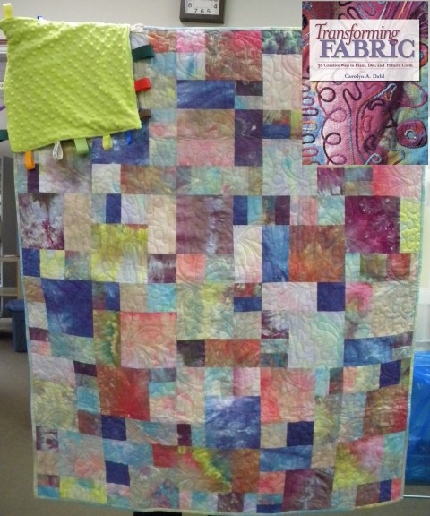 This 37” X 45” baby quilt is made with ice dyed fabrics and backed with cozy apple green minky. It is both colourful and warm. The leftover minky has been made into a snuggly ribbon blankie. Library staff chose the book Transforming Fabric by Carolyn Dahl to accompany Sue's quilts.