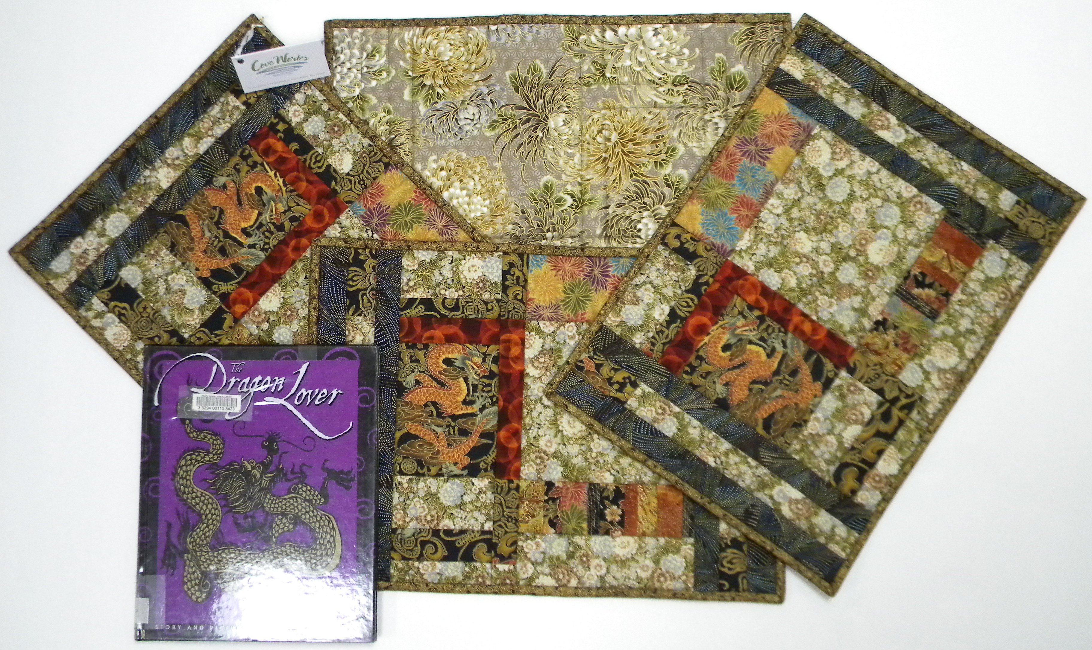 Four dragon placemats to bring you good luck and good fortune as you dine with family and friends. Dolly reports that she had this piece of dragon fabric and it captured her imagination, so she cut out the dragons and then built up the placemats from there. The dragon lover and other Chinese proverbs by Yong-sheng Xuan has been paired with this lovely set.