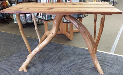 This funky table has been created using local alder and cedar woods and took numerous hours to create, though the cost for materials was fairly little. It's been paired with Creative Display by Geraldine James.