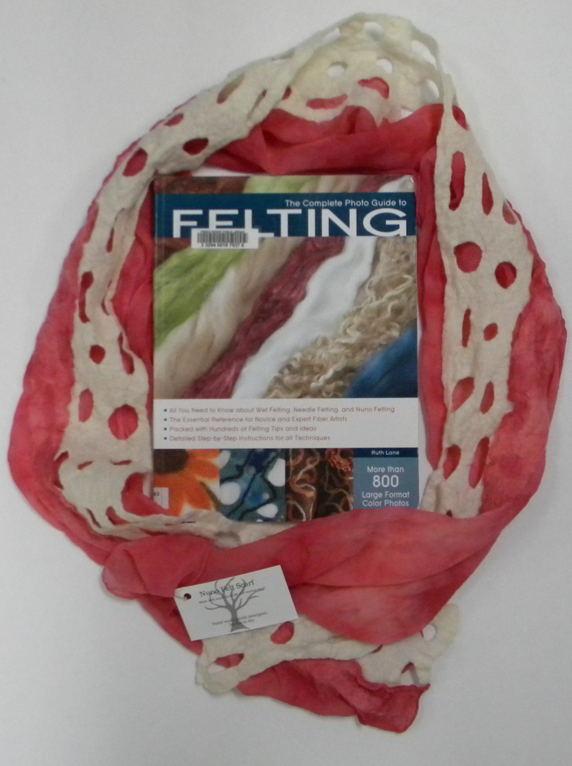 This 5'6" scarf is made from hand-dyed silk and merino wool. The hand-dying results in subtle patterns in the pink silk, and we've paired this item with The Complete Photo Guide to Felting by Ruth Lane.