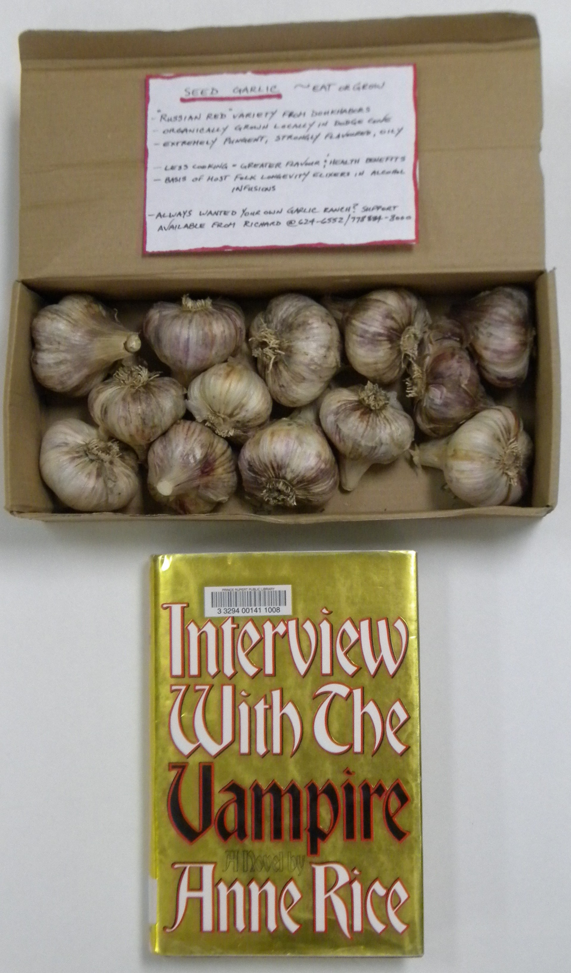 For eating or growing, this is the Russian Red variety of garlic, originall from Doukhabors and organically grown in Dodge Cove. It's very pungent, flavourful and oily, and if you would like to grow rather than eat, Richard is offering phone support. In honor of Halloween, we've paired it with Interview with the Vampire by Anne Rice..