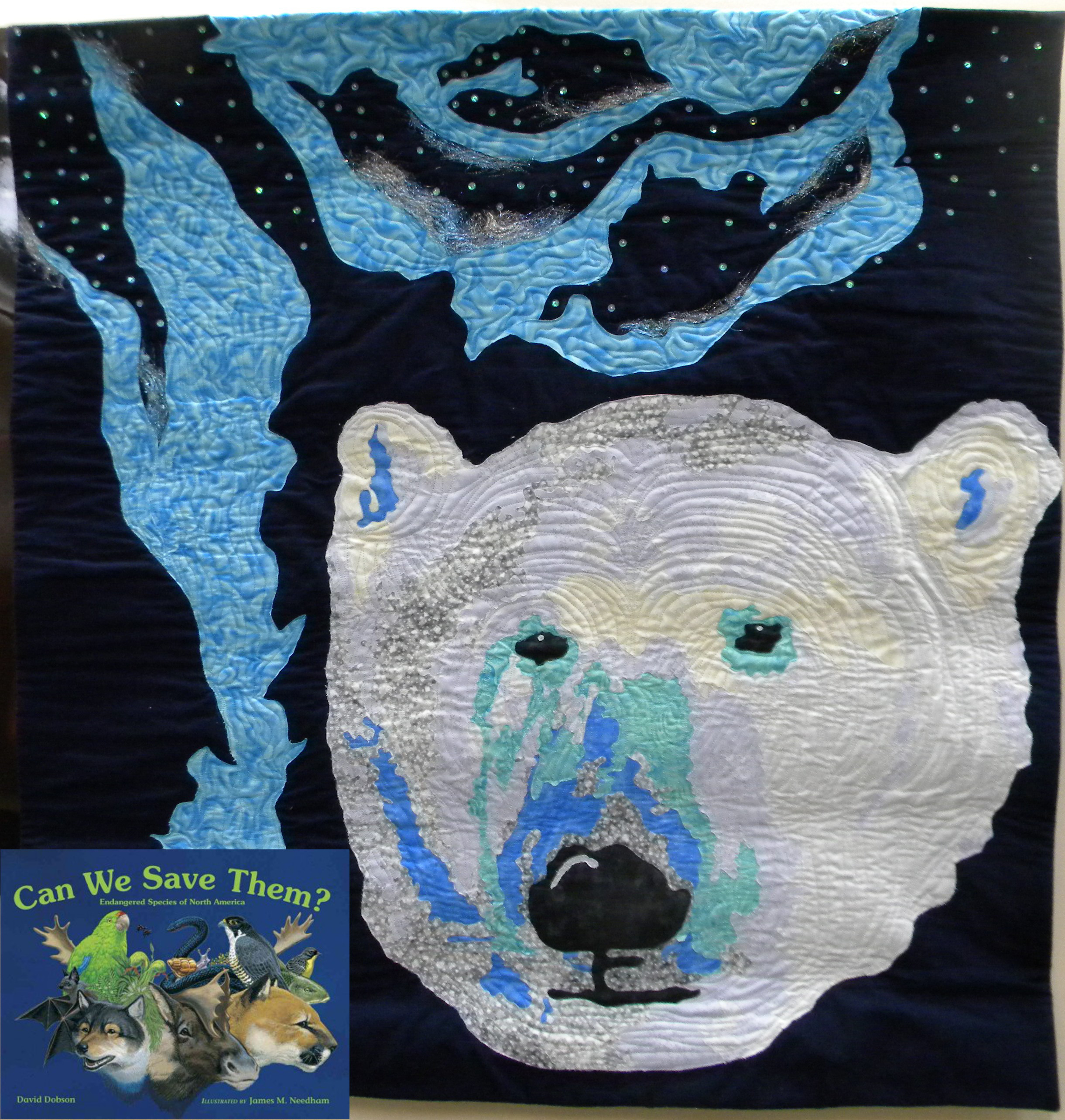 Made from one of the Rob Appel Endangered Species patterns, this polar bear wall hanging is over four feet wide and is made from more than 50 individual fabric pieces and his hand embellished with beading. It was inspired by Can We Save Them?: Endangered Species of North America by David Dobson.