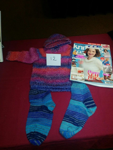 Adult small socks, a size 6 baby sweater and two toques, these cool purple and blue woolen knits will have you and a little one ready for winter.