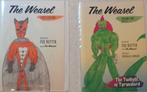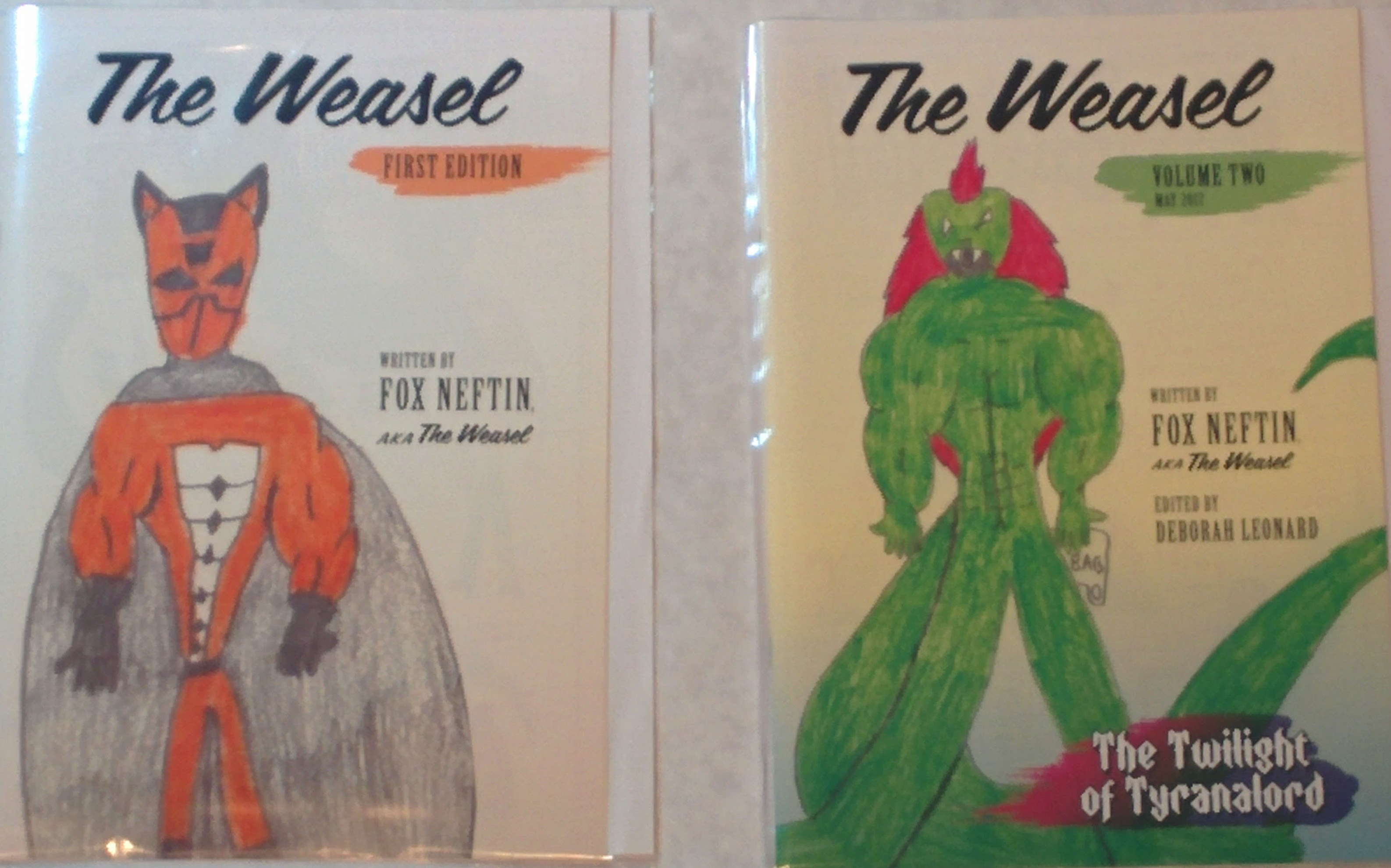 Fox is a regular visitor to our library and a great help with our book sale books. “The Weaselzzz” super hero series was created by by Fox all by himself, because he wanted to create a new super hero. Fox spent weeks and months drawing and colouring his creation and we are thrilled to have a first edition of "The Weasel" and “The Weasel Volume 2” Fox wants us to know that he is ‘the Weasel’ as he describes in his comic books. Spider-Man is a big influence for Fox, so we paired his work with Marvel Comics' The Savage Land.