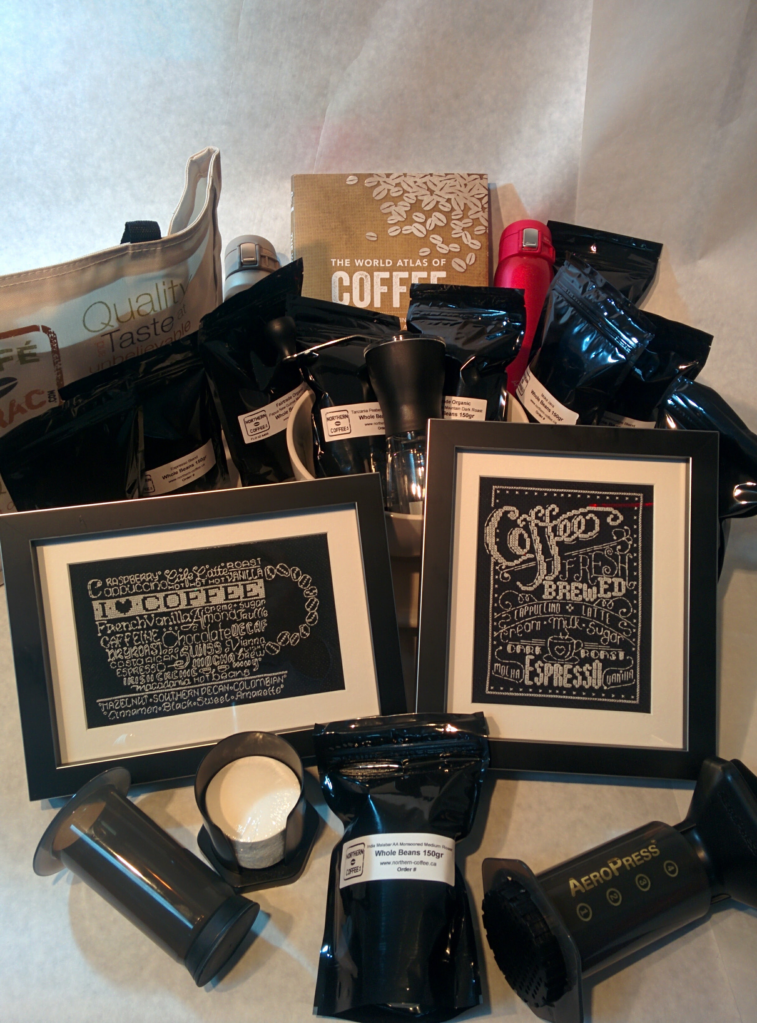 This pack has everything short of a proper copper coffee pot! Two Kojirushi mugs that will keep your coffee warm 9 to 5, an Aeropress coffee maker to make it tasty, a hand grinder to keep your beans fresh, 10 third-pound coffee bags to give you a world-spanning sample, a coffee-themed tote, a coffee table book about, well, coffee, and two framed coffee-themed cross-stitches for the wall. Even a cup and saucer big enough for Monday morning...maybe. It's been paired with the book that it includes The World Atlas of Coffee: from Beans to Brewing by James Hoffmann.