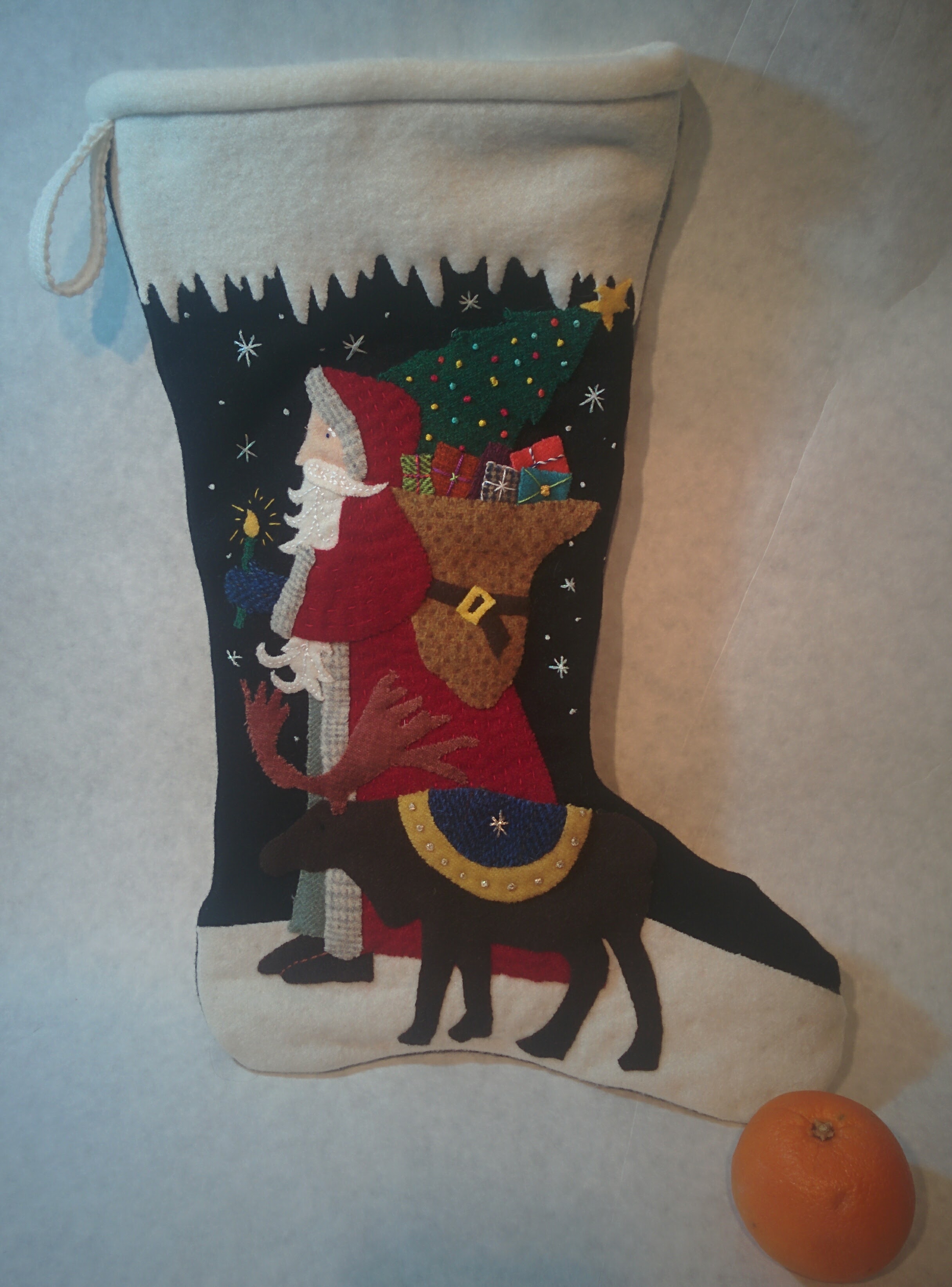"I made stocking by tweaking a pattern published by the Chesiwick Company. I used 100% wool much of it up-cycled from Harris Tweed-type castaways that I then felted and dyed myself. The pieces were appliqued and embroidered by hand. One of my favourite Christmas stories is The Christmas We Moved to the Barn by Alexandra Day because it is almost entirely beautiful illustrations with no words, so you can tell the story yourself. I would be happy to applique a name on the top of the stocking for no extra charge if the winning bidder would like that.