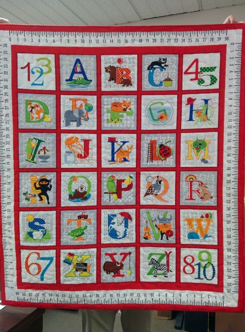 Donated by the skilled sewist at our new fabric store! This colourful small quilt would be great for a stroller, car seat, crib, or for you as you rock your baby wrapped in your arms. We paired this quilt with A to Z, by Sandra Boynton.
