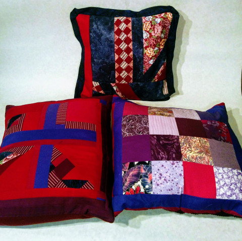 The tops of these pillows were made using scraps of patchwork created by the late Jean Clerihue, possibly as learning projects, as Jean was always interested in a new technique or creative pattern. It’s been paired with Sunset’s Simply Pillows.