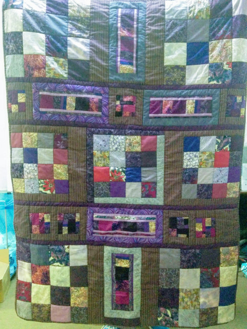 That was the name the late Jean Clerihue wrote on the box that Trish found, which included a few finished squares. Trish copied the squares Jean had made, added purple fabrics for sashing and finished up yet another of the surprise projects Jean had left. Trish was inspired by the color and title on the box to choose Alice Walker’s The Color Purple to accompany this piece.