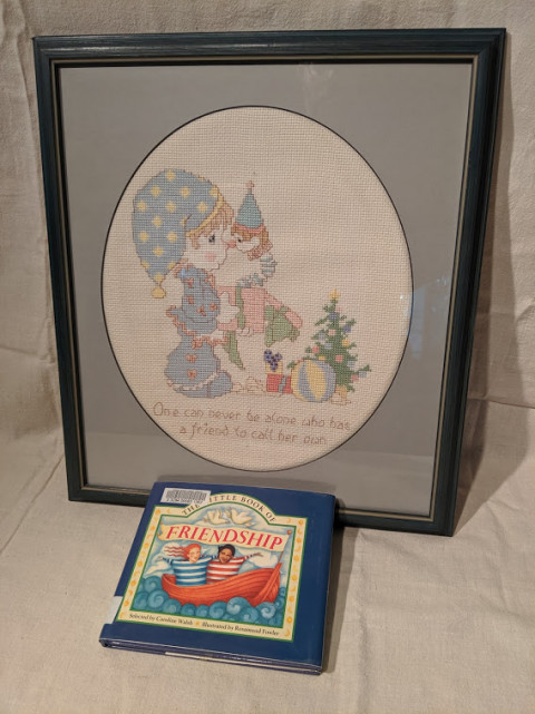 Leslee Bruce: Framed “Child's Friend” Needlepoint: a lovely, gentle image with a sweet motto to decorate a baby's nursery or child's room. This item took many hours to create. Paired with the poetry collection: “The Little Book of Friendship” selected by Caroline Walsh; illustrated by Rosamund Fowler