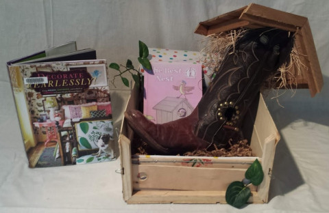 Tim Chernoff & Rydell Magliocchi: “Home Tweet Home” Boot Birdhouse: One of a kind boot birdhouse hand-crafted with heart and sole! Inspired by P.D. Eastman's 1968 Classic “The Best Nest” and the a simpler time - when a 'TWEET' was merely a sound made by birds! Feathered friends will flock to this cozy retreat. Featuring a vintage Mexican leather boot, hand-hewn cedar shingles and a retractable hanging string. As with most of our shop projects, we don't record dollars and hours. Instead we use a complex algorithm that factors in six packs, trips to Rona, and advice from neighbours. “Decorate Fearlessly: with whimsy, confidence and a dash of surprise...” seemed appropriate.